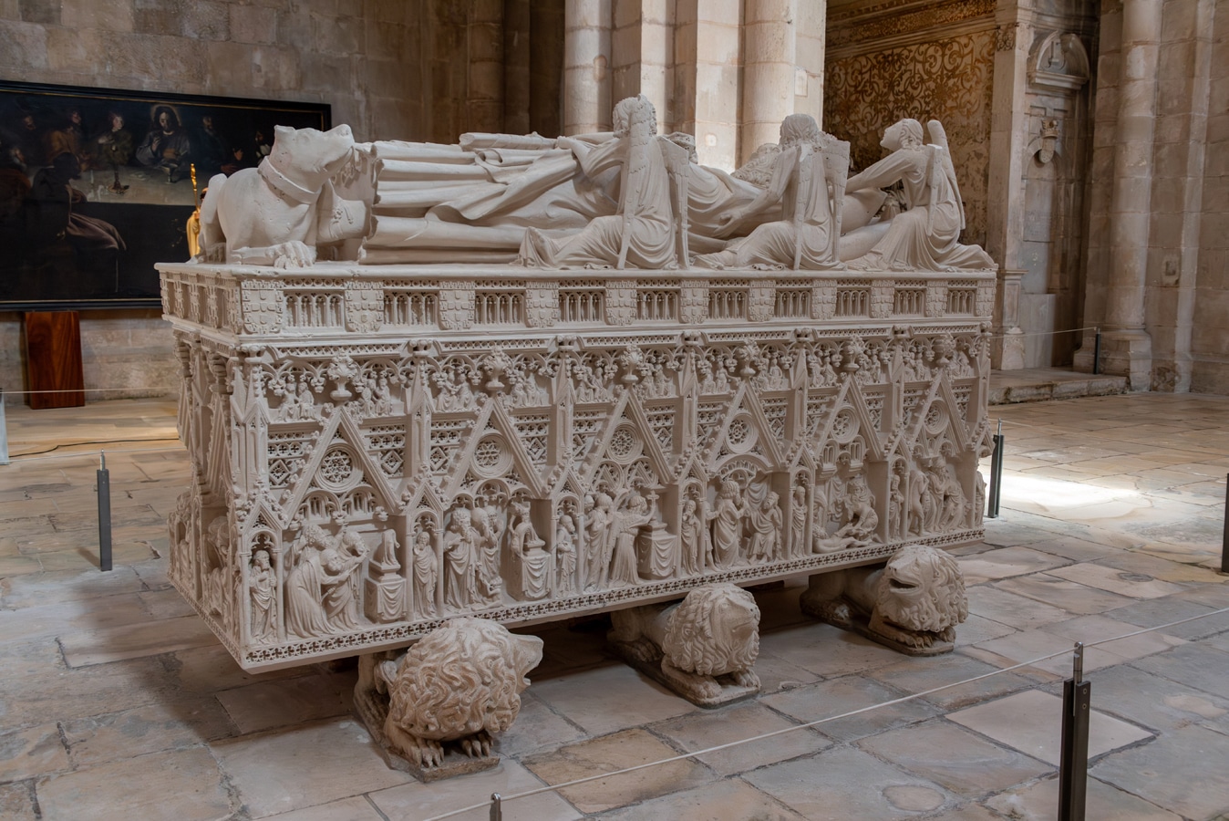 Největší dojem na mě však udělaly dva kamenné sarkofágy v kostele, které zosobňují lásku mezi princem Pedrem a Inês de Castro. Tato portugalská verze Romea a Julie není pohádkou, ale brutálním příběhem plným krve, politiky a pomsty. Král Afonso IV. vybral princi Pedrovi za manželku Constanzu, dceru mocného kastilského feudála. Bylo to běžné politické manželství, jehož cílem bylo posílit spojenectví. Pedro se však zamiloval do její dvorní dámy Inês de Castro, která se nakonec stala jeho oficiální milenkou. Constanza navíc krátce po porodu syna, budoucího krále Ferdinanda I., zemřela. Pedro postupně zplodil s Inês čtyři nemanželské děti. Portugalská šlechta se proto obávala, že by se s ní mohl oženit a jejich děti by pak musely být uznány jako legitimní dědicové, takže rod Castro by si mohl v budoucnu činit nárok na portugalskou korunu. Král Afonso IV. se proto rozhodl pro nejkrutější čin – poslal tři vrahy, aby Inês zabili v zahradách paláce v Coimbře, kde žila. Byla to politická poprava v zájmu koruny. Když se Pedro o dva roky později stal po smrti svého otce novým králem, rozhodl se pomstít. Dva ze tří vrahů se mu podařilo zatknout a dal je krutě popravit. Pedrova upřímná láska k Inês je plná tragických paradoxů, ale zůstane navždy živá, protože jejich nádherně zdobené kamenné sarkofágy stojí naproti sobě v hlavní lodi klášterního kostela, aby při Posledním soudu mohli oba vstát a podívat se jeden druhému do očí. Na Pedrově je nápis Até ao fim do mundo, „až do konce světa“.